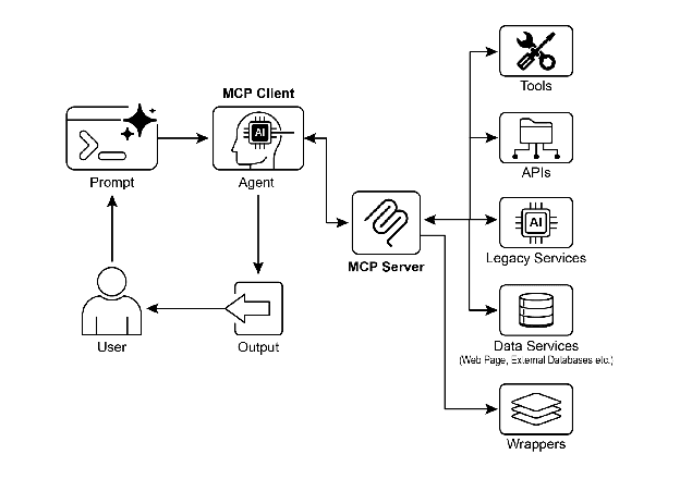 相比之下,模型上下文协议(MCP)作为 LLM 发现、通信和使用外部能力的标准化接口运行。它作为开放协议促进与各种工具和系统交互,旨在建立任何兼容工具可被任何兼容 LLM 访问的生态系统。这促进了不同系统和实现间的互操作性、可组合性和可重用性。通过采用联合模型,我们显著提升互操作性并释放现有资产价值。此策略允许我们通过简单包装符合 MCP 接口将分散和遗留服务引入现代生态系统。这些服务继续独立运行,但现可组合到新应用程序和工作流中,其协作由 LLM 协调。这促进了敏捷性和可重用性,而无需对基础系统进行昂贵重写。